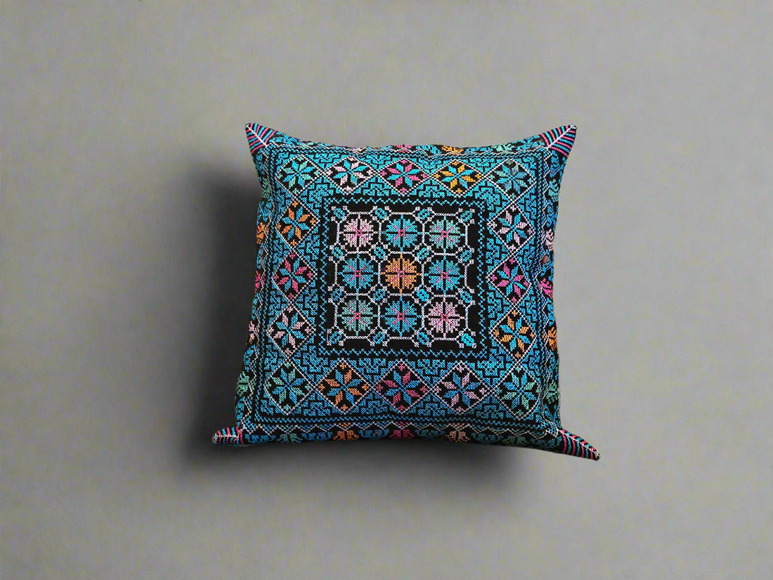 Blue Embroidered (Tatreez) Throw Pillow Cover - Machine Embroidered