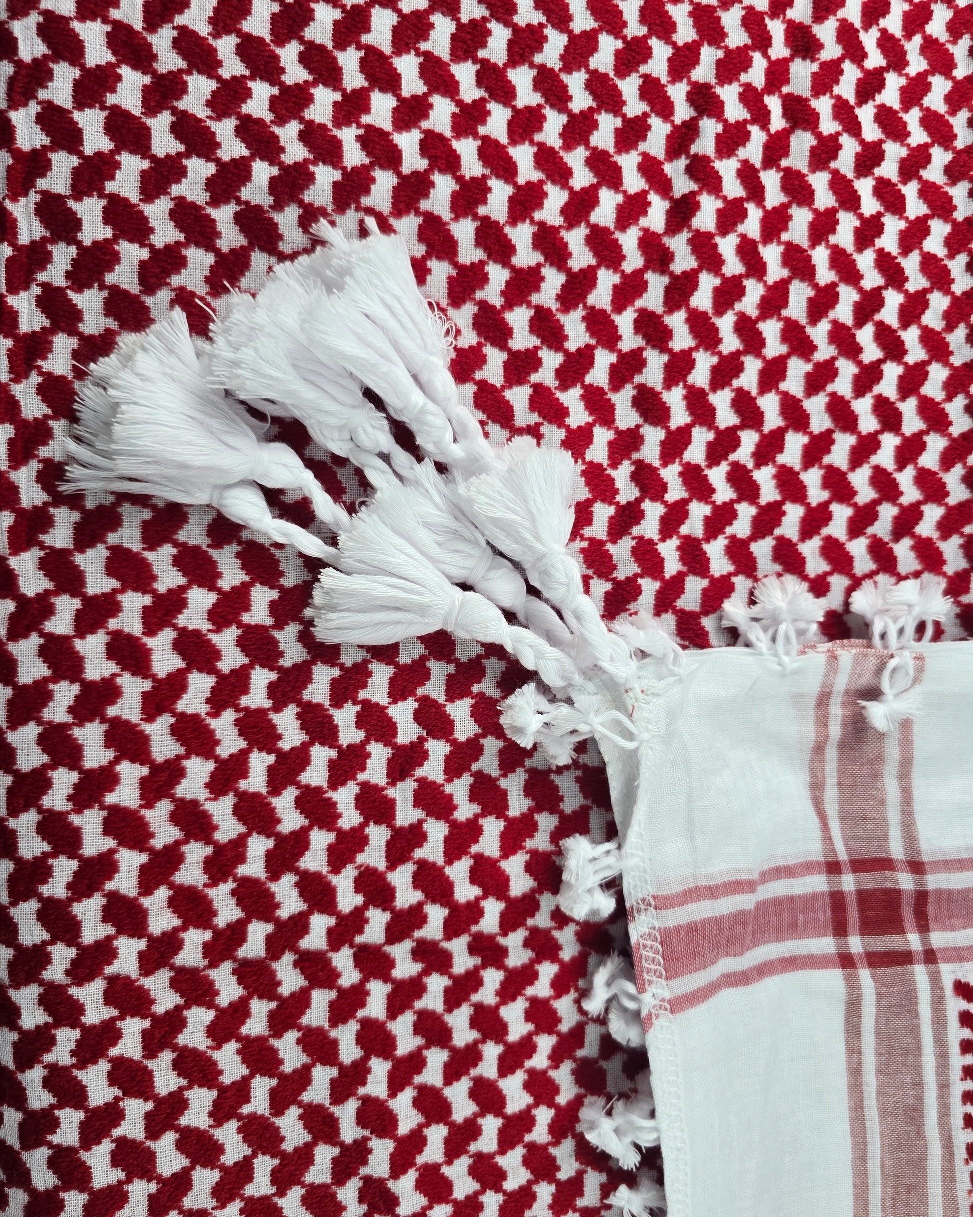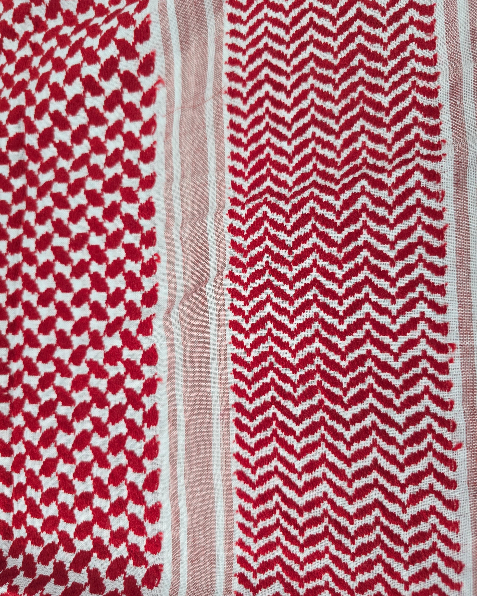 The red keffiyeh is the oldest color — worn across the Arab world for generations, from the Jordan River to the Gulf, from the mountains of the Levant to the streets of Damascus. It is not a trend. It is a tradition that has outlasted every attempt to erase the people who wore it.